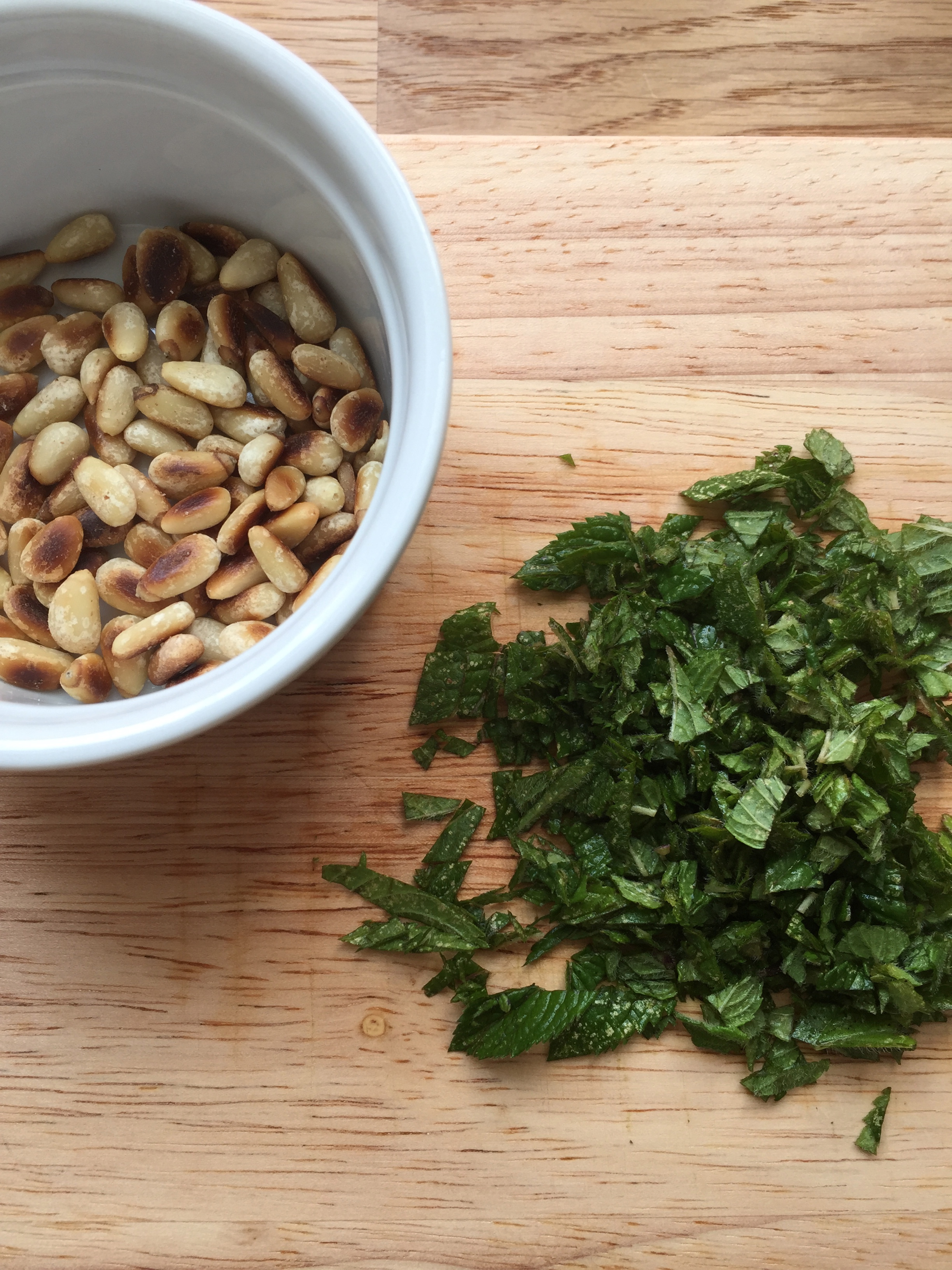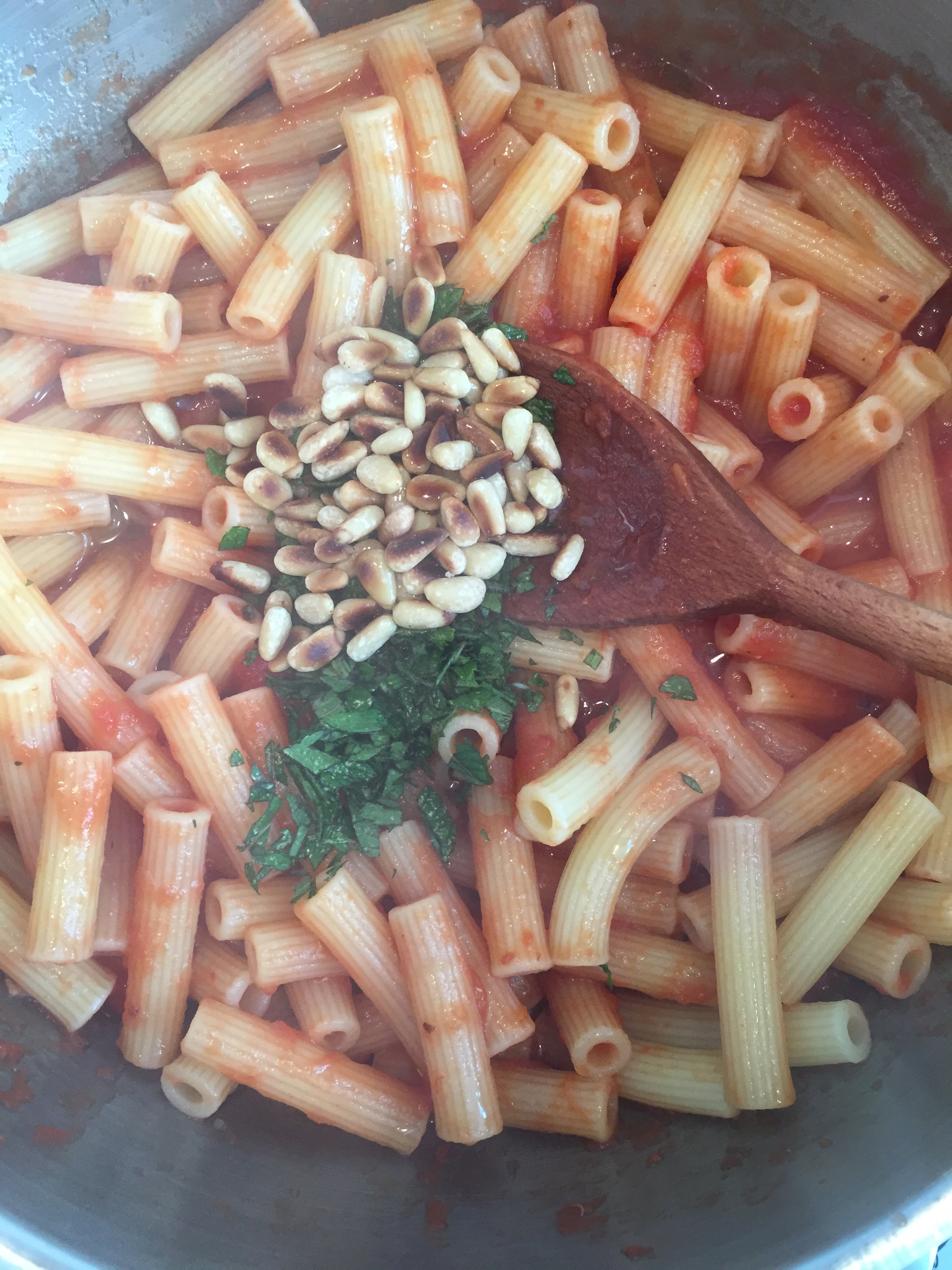 Zubereitung: Pasta kochen, Pinienkerne rösten, Tomaten einreduzieren und mit etwas Nudelwasser aufgießen. Minze hacken und zusammen mit Salz, Pfeffer und etwas Olivenöl das Sugo würzen.