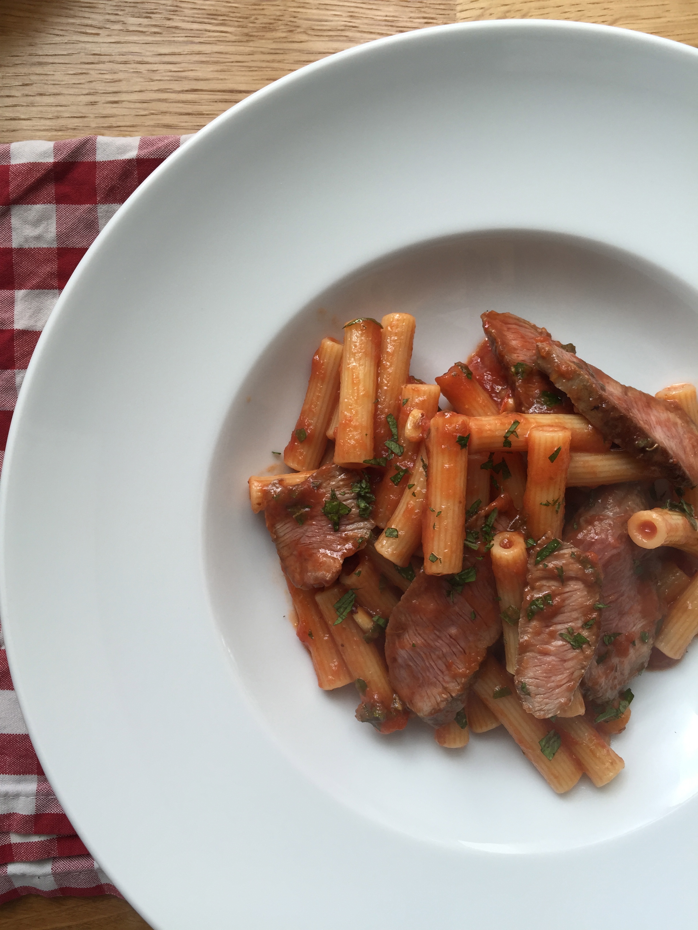 Die Zutaten: Pasta, Lammfilet zum Kurzbraten, passierte Tomaten, Pinienkerne, Minze, Olivenöl, Salz und Pfeffer.