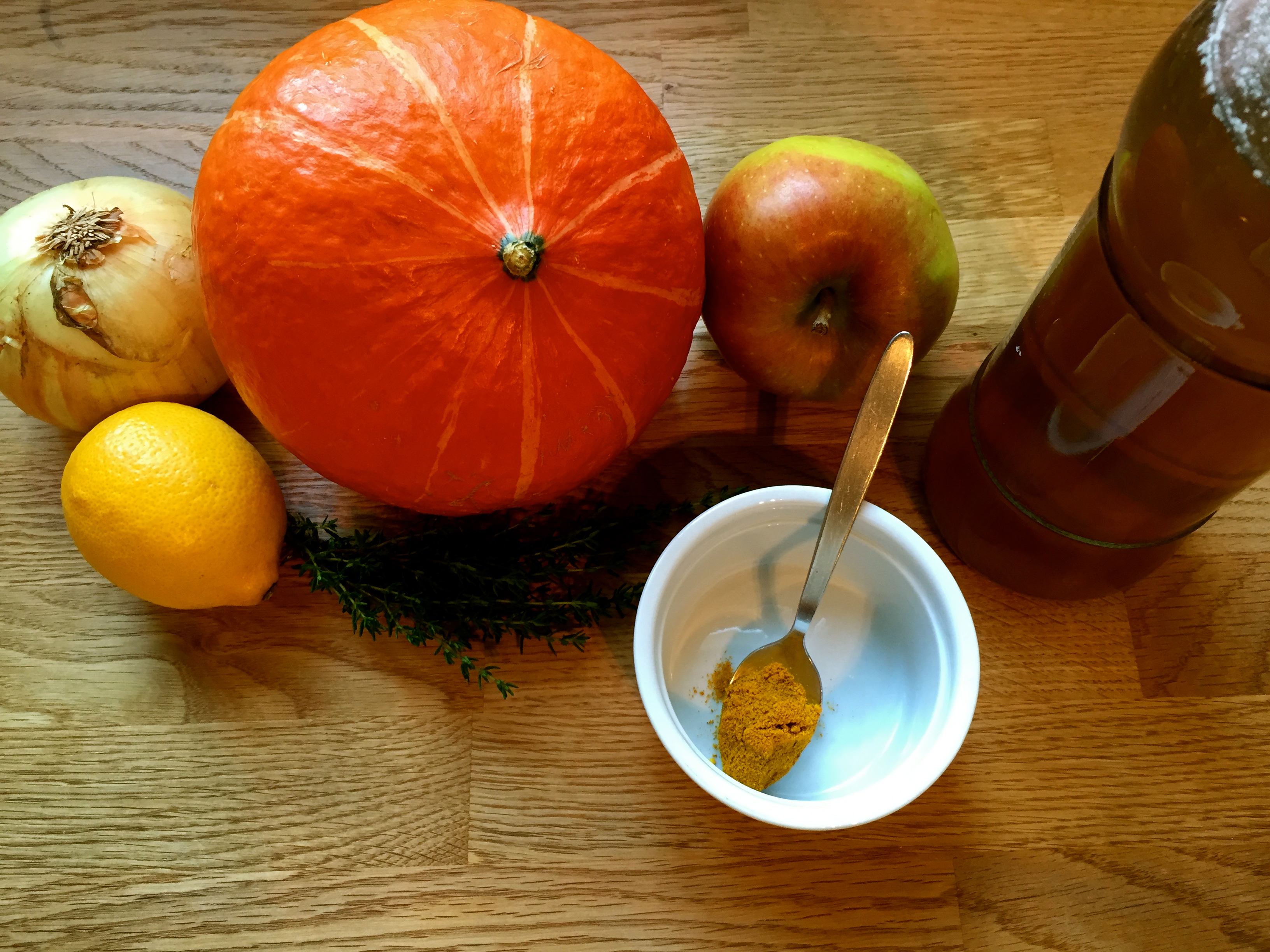 Die Einkaufsliste: 1 kleiner Hokkaido (900 g), 1 Apfel, 1 Gemüsezwiebel, 1 Zitrone, 1x Brühe (hier Rindsboullion), 1 Sträußchen Thymian, 1 Teelöffel Curry, 1 Rote Beete und 1 Becher Sahne (nicht im Bild).