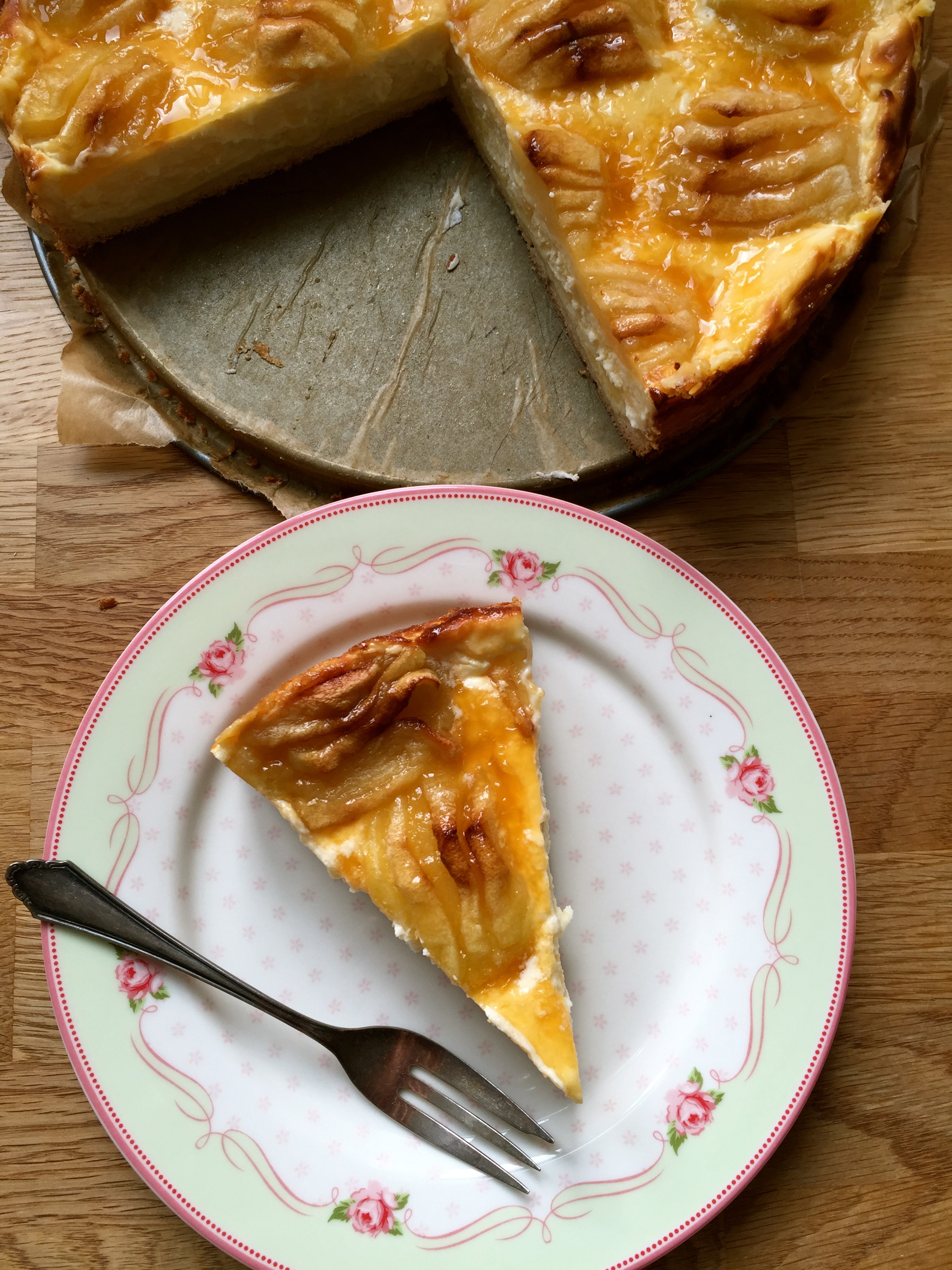 Man nehme: 600 g kleine Äpfel, 500 ml Milch, 225 g Zucker, 2 Päckchen Vanillepuddingpulver, 75 g weiche Butter, 1 Ei, 200 g Mehl, 1/2 Teelöffel Backpulver (Weinstein), Salz, 2 Esslöffel Zitronensaft, 250 g Magerquark, 400 g Schmand und 70 g Aprikosenkonfitüre.
