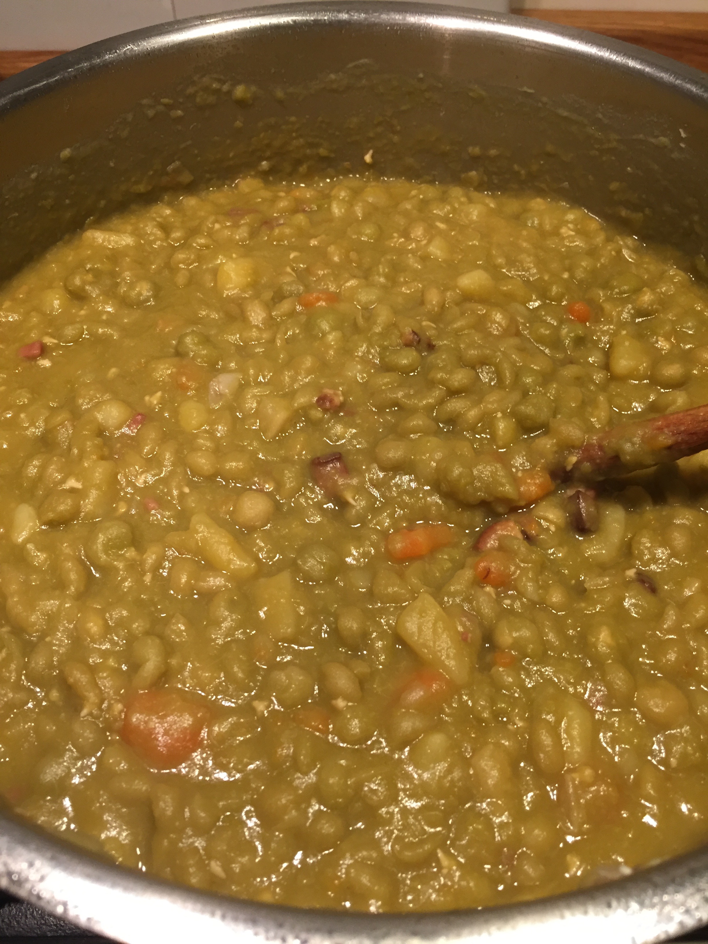Zutaten: 1 kg getrocknete Erbsen, Knollensellerie, Möhren, Kartoffeln, Speck, Zwiebeln, Fond. Und Wild-Wiener.