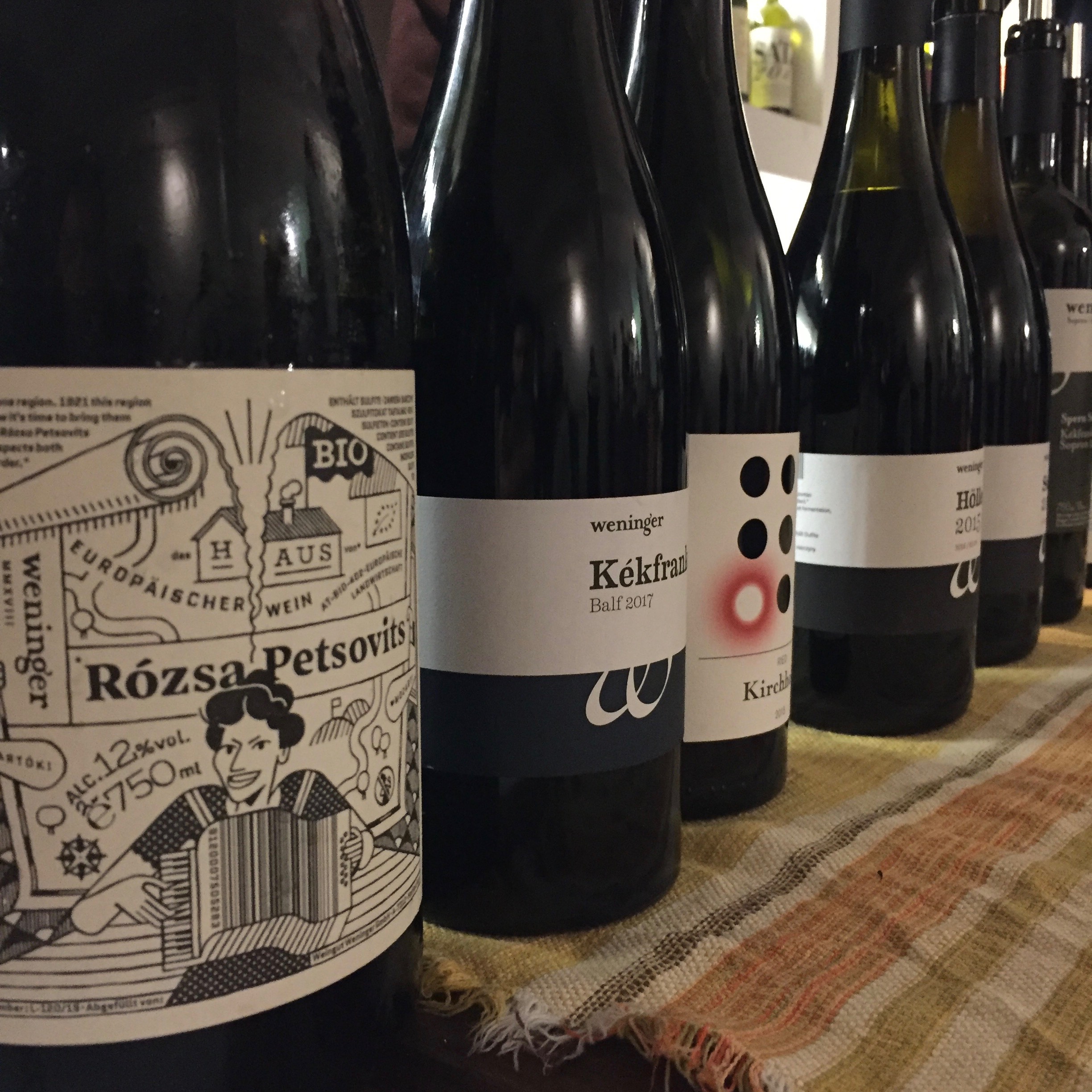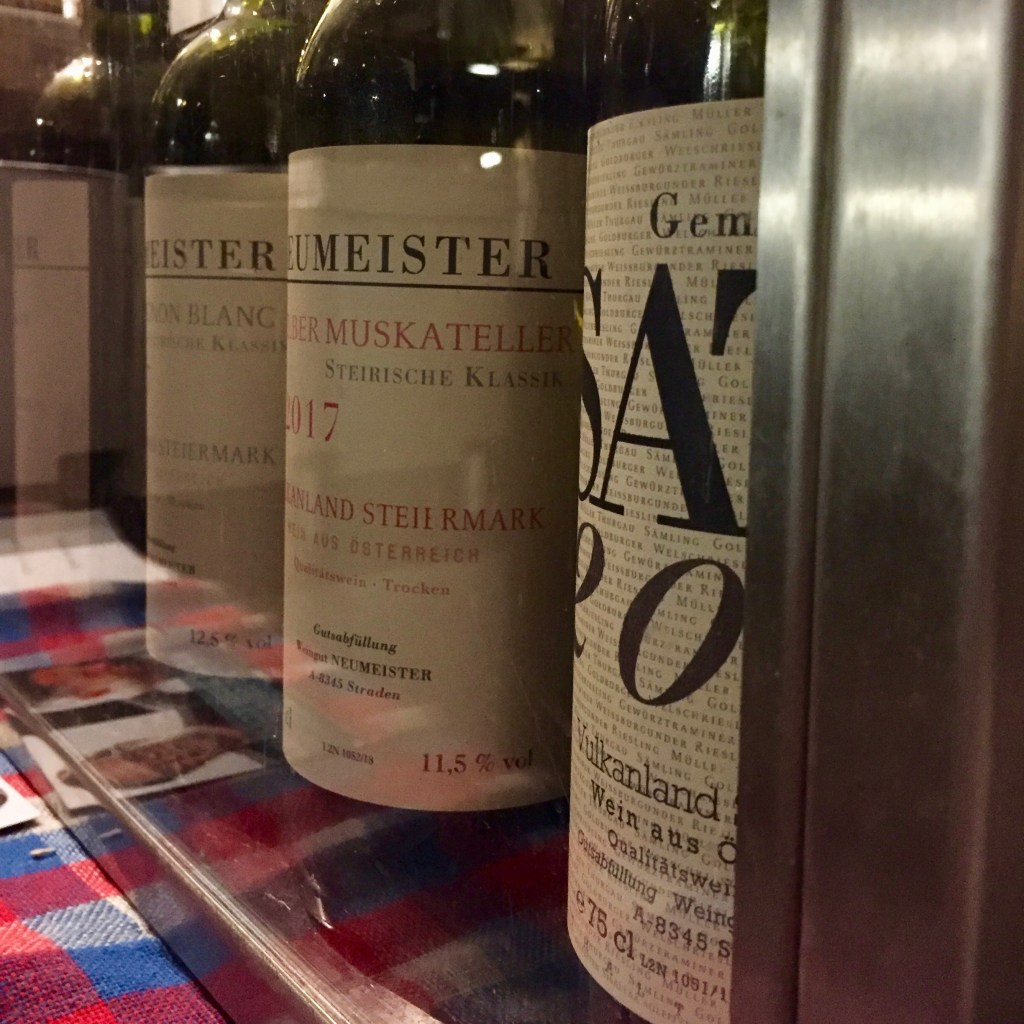 Der Trinkfluss des Abends: Gemischter Satz 2017, Gelber Muskateller 2017, Sauvignon blanc STK 2017 und Moarfeitl 2016, Grauburgunder Straden 2018 und Saziani 2015, Weißburgunder Klausen 2017 und Roter Traminer Steintal 2017.