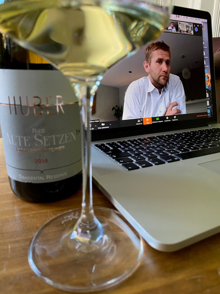 Zunächst ging die virtuelle Reise ins Traisental, Österreichs kleinstem Anbaugebiet. Markus Huber erzählte wie die Handschrift eines Winzers in den Wein kommt und warum er trotz historisch bedachter Veltlinerverbreitung im Traisental auch Weißburgunder Wurzeln schlagen lässt. Selbst Geologie-Ikone Dr. Maria Heinrich ließ es sich nehmen bei dieser neuen Verkostungsform dabei zu sein.