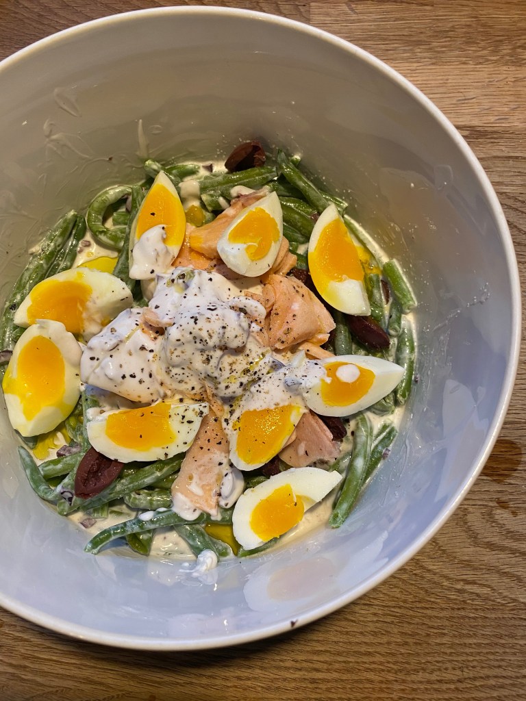 Dann die Bohnen im Dressing schwenken und auf Teller geben. Die Eier vierteln und darauf verteilen. Den Lachs von der Haut ziehen, herzhaft zerpflücken und zu den Bohnen und Eiern geben. Die restlichen gehackten Oliven drüberstreuen und mit etwas Dressing beträufeln. Ein Schuss Olivenöl und Pfeffer, fertig. Bon appétit!