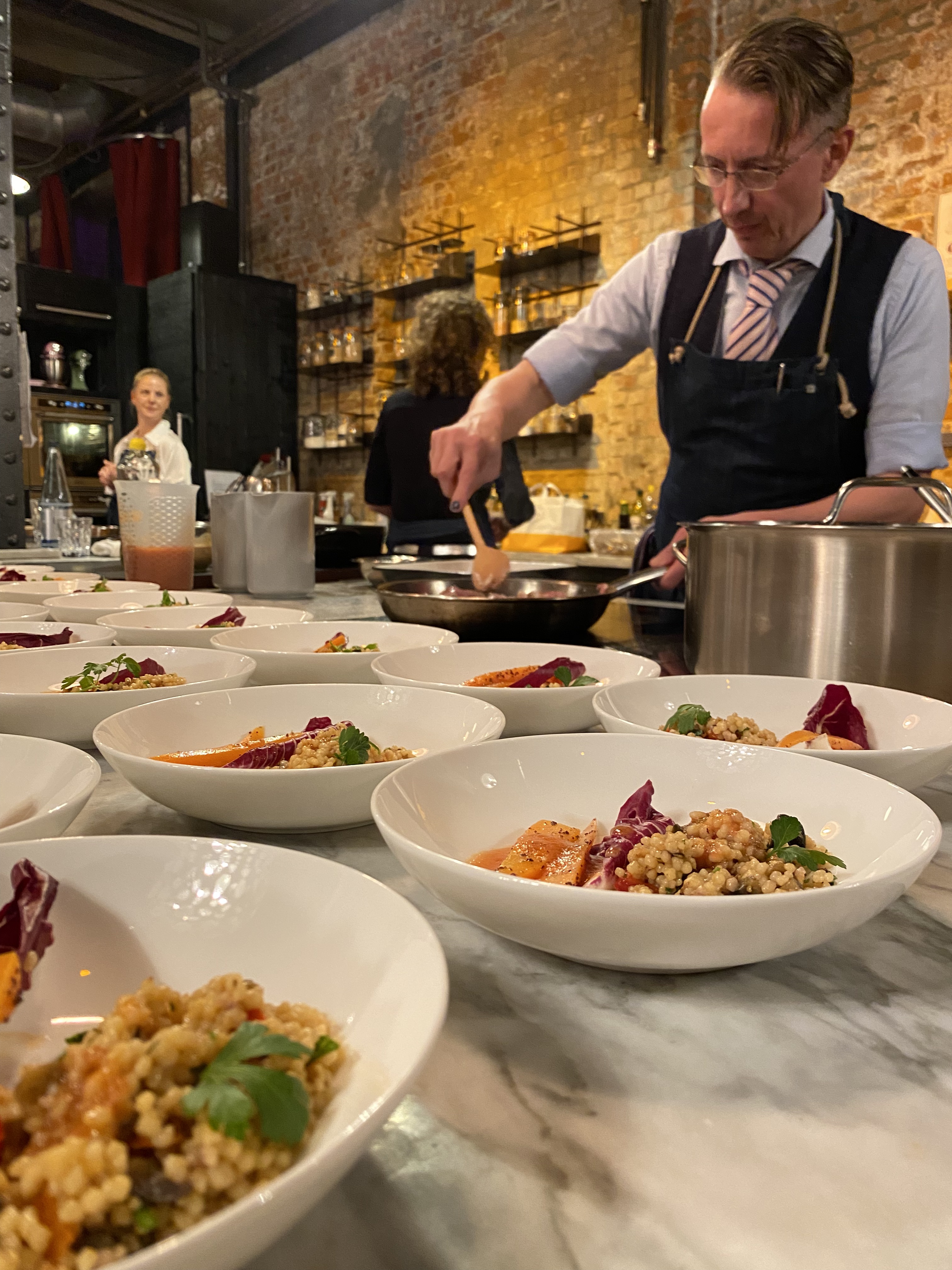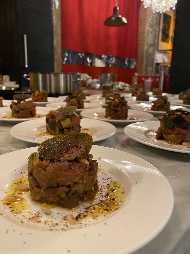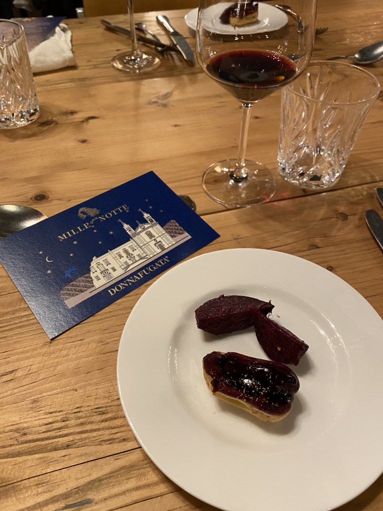 Das Jahr 2018 war, im Gegensatz zu Deutschland, niederschlagsreich und verhältnismäßig Kühl, was man dem Wein auch anmerkt. Erstaunlich frisch und elegant präsentiert er sich, wo man vielleicht Hitze erwartet hätte. Dazu serviert Michele Wolken eine Caponata „San Bernardo“ und eine Kalbslebermousse in Brandteig, dazu Rote Beete. Ein spannender Kontrast mit dem der Wein mehr als diplomatisch umgeht. Er schafft es der erdigen Beete eine Frische und Fruchtigkeit zu verleihen!