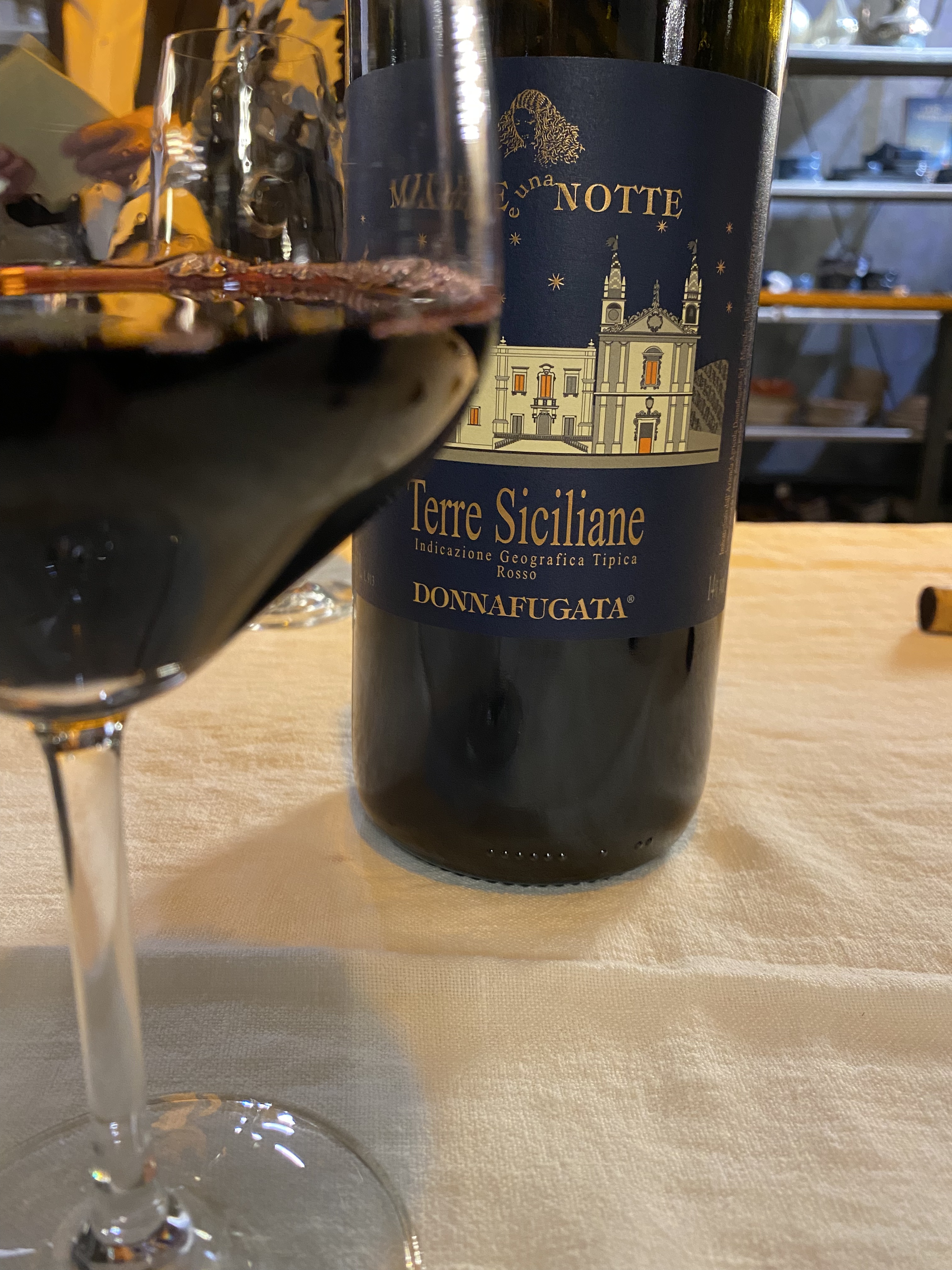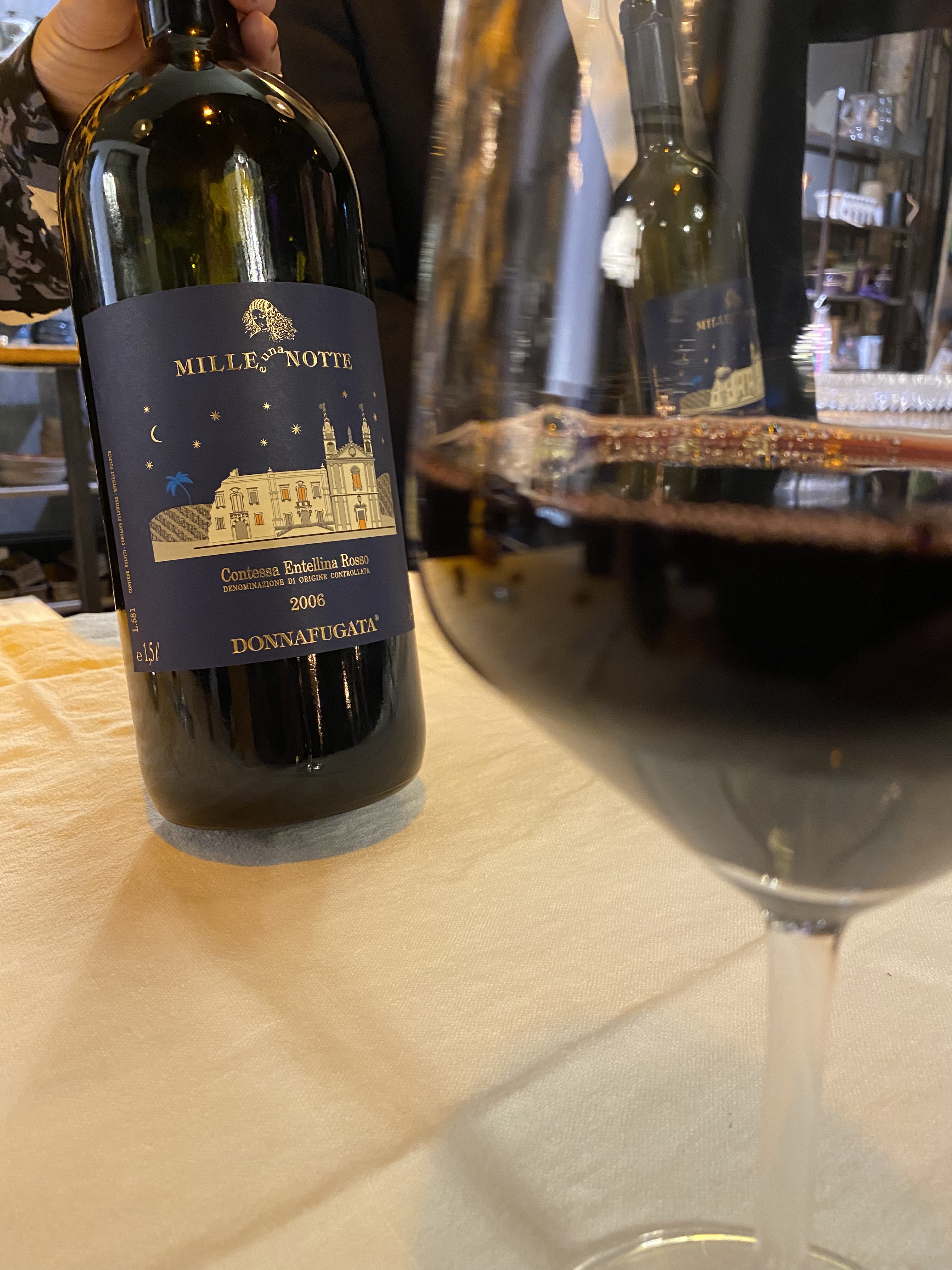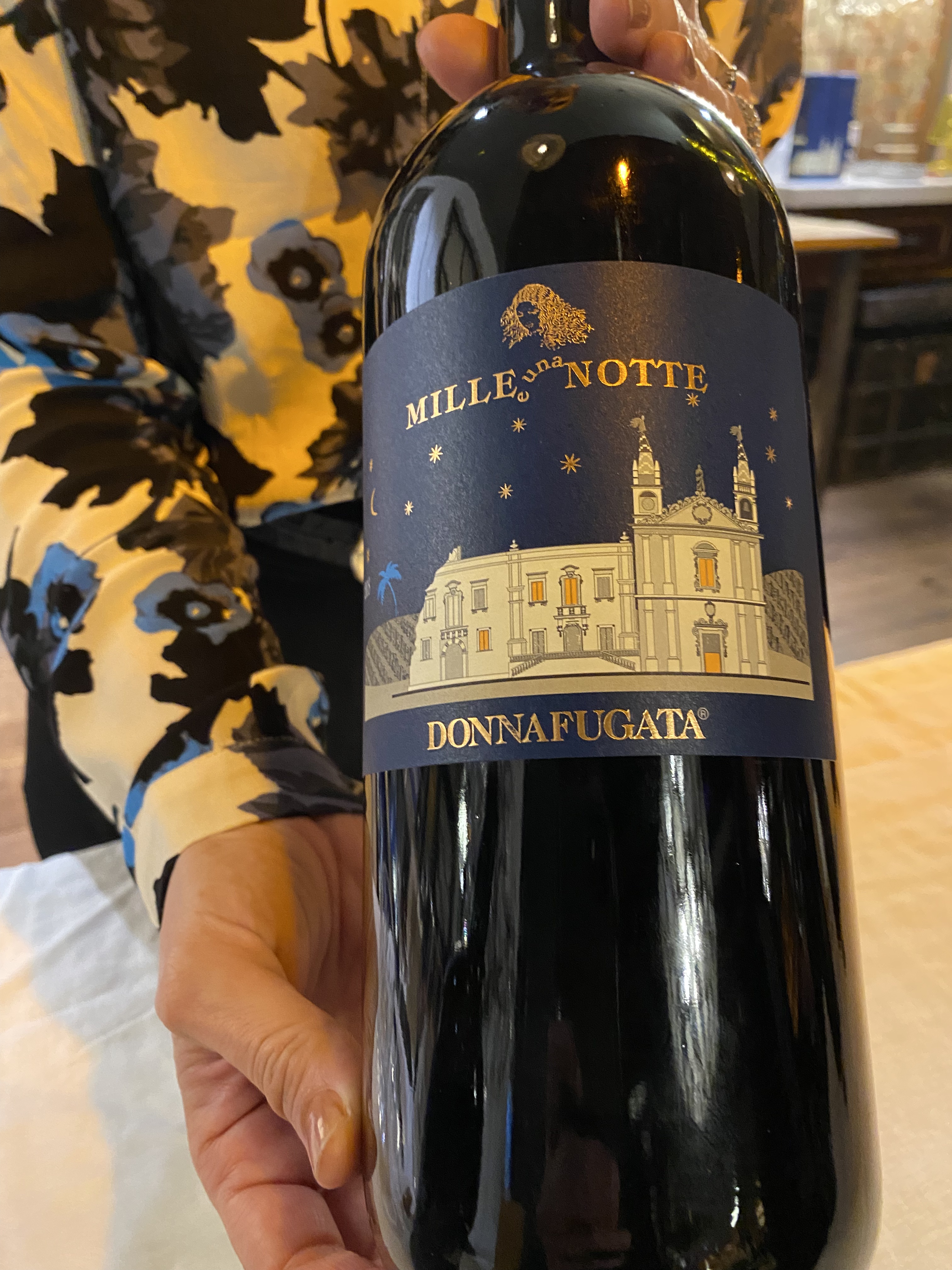 Glanzvolles Highlight waren aber die drei Jahrgänge des Mille e una Notte, den die Familie mit Giacomo Tachis, dem Vater der Supertuscans, ins Leben gerufen haben. Dieser suchte nach Sassicaia, Solaia und Tignanello eine neue Herausforderung im Nero d’Avola, der roten Heldin Siziliens. Das Etikett zeigt übrigens den Palast unter Sternenhimmel, der Rückzugsort der geflüchteten Königin und Lieblingshaus des Schrifstellers ist. Der Wein ist eine Jahrgangsselektion mit 14-tägiger Mazeration auf den Schalen und Ausbau in neuen Barriques.