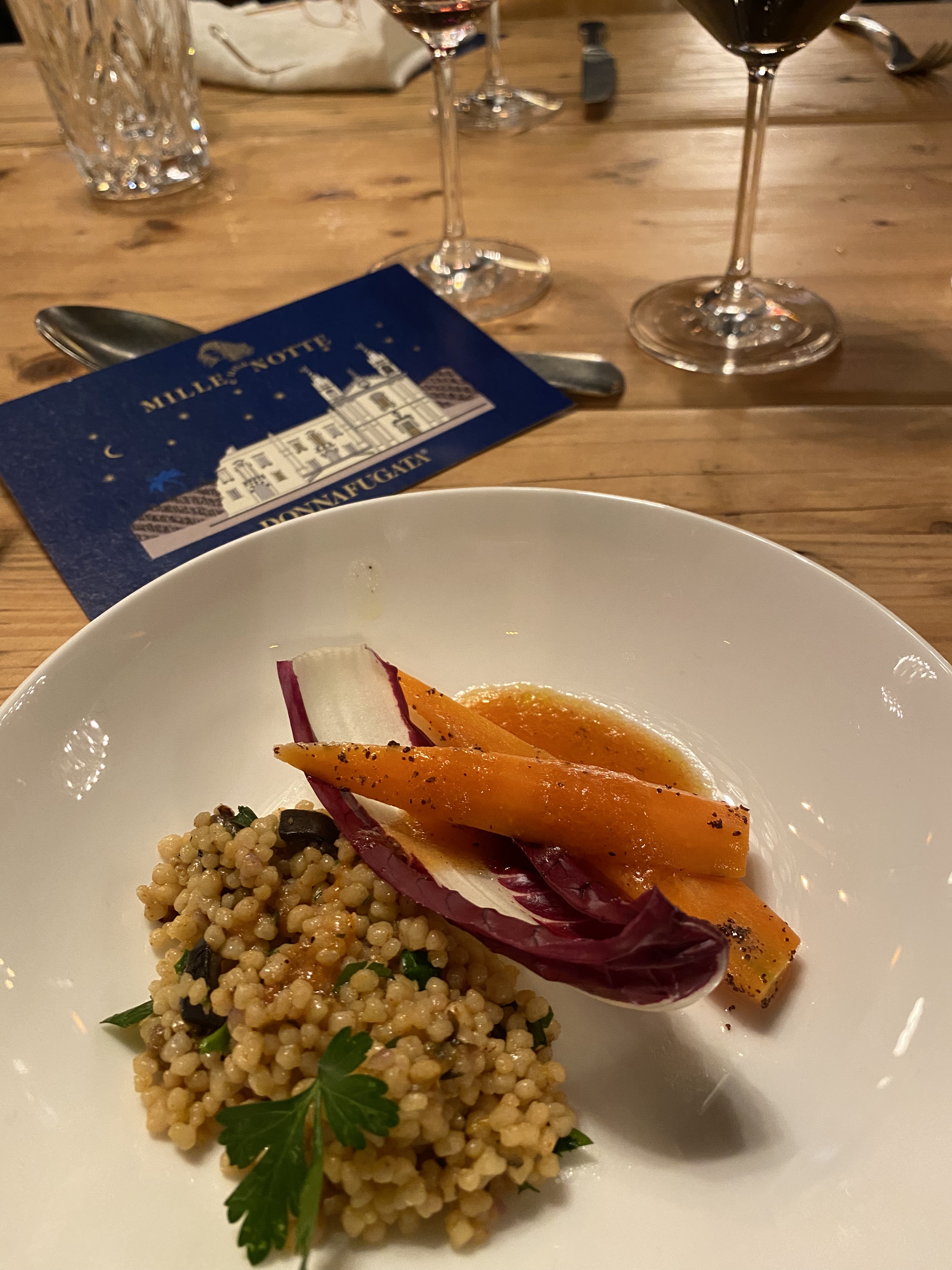 2012 war in Sizilien ein sehr sonnenverwöhntes Jahr, der Wein strahlt diese Kraft auch aus und präsentiert sich hocharomatisch. Dazu gesellt sich ein Couscous mit Gemüse und ein Perlhuhn mit wildem Brokkoli zu einer Jus aus Ben Ryé, dem Süßwein des Hauses. Wieder maximaler Kontrast mit dem der Wein wunderbar umzugehen weiß. Bei dem opulenteren Jahrgang hätte man damit gerechnet, dass er eine erdrückende Dominanz zur Zartheit und Frische des Couscous an den Tag legt – aber hier nimmt er sich weit weniger wichtig und lässt dem Gericht seine Stimme.