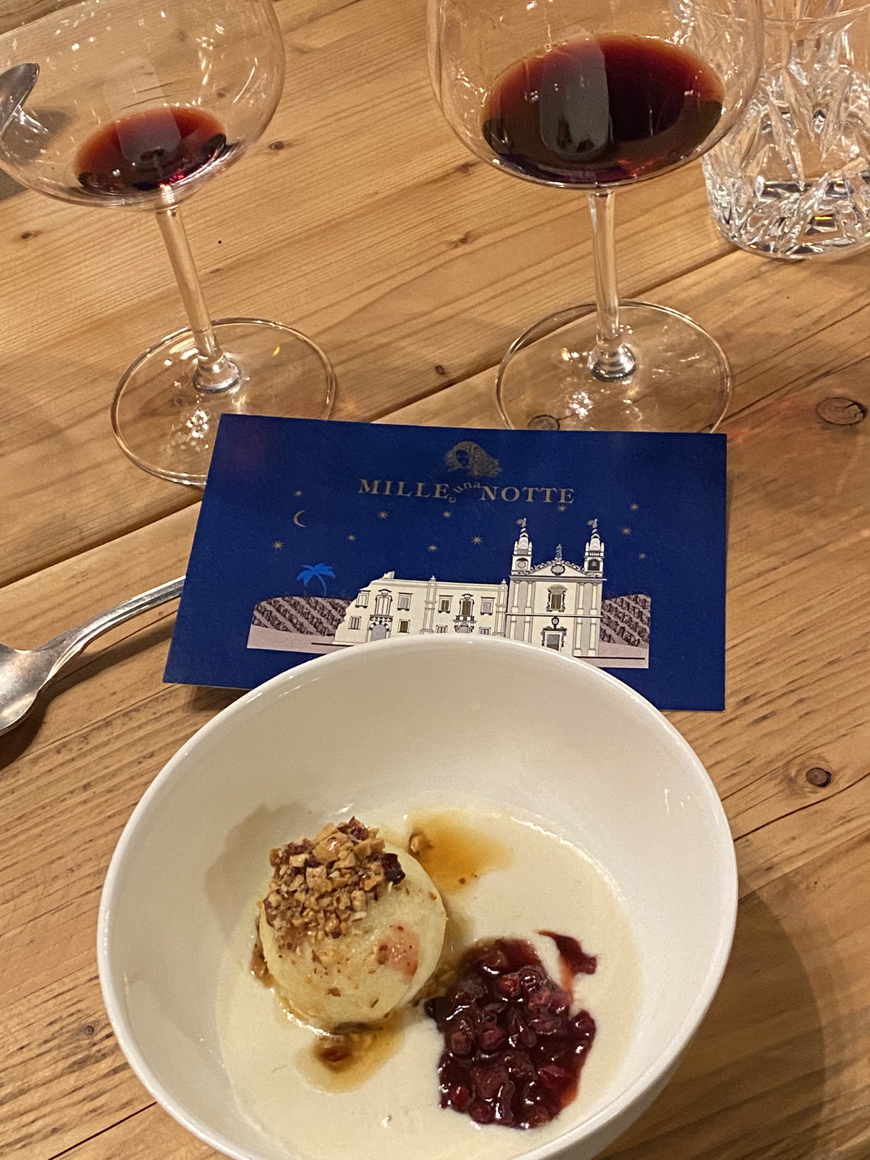 Der Jahrgang 2006 ist ein anmutiger Wein, der sogar das süße Spiel versteht. Mit einer „Deconstruction“ eines sizilianischen Dessertklassikers: Ricottacreme, Kichererbsen und Weizen mit Modica Schokolade und einem deutschen Grießknödel von und zu Nussbutter und Marzipan-Sauce. Dolce vita, dass Weihnachtsträume weckt!