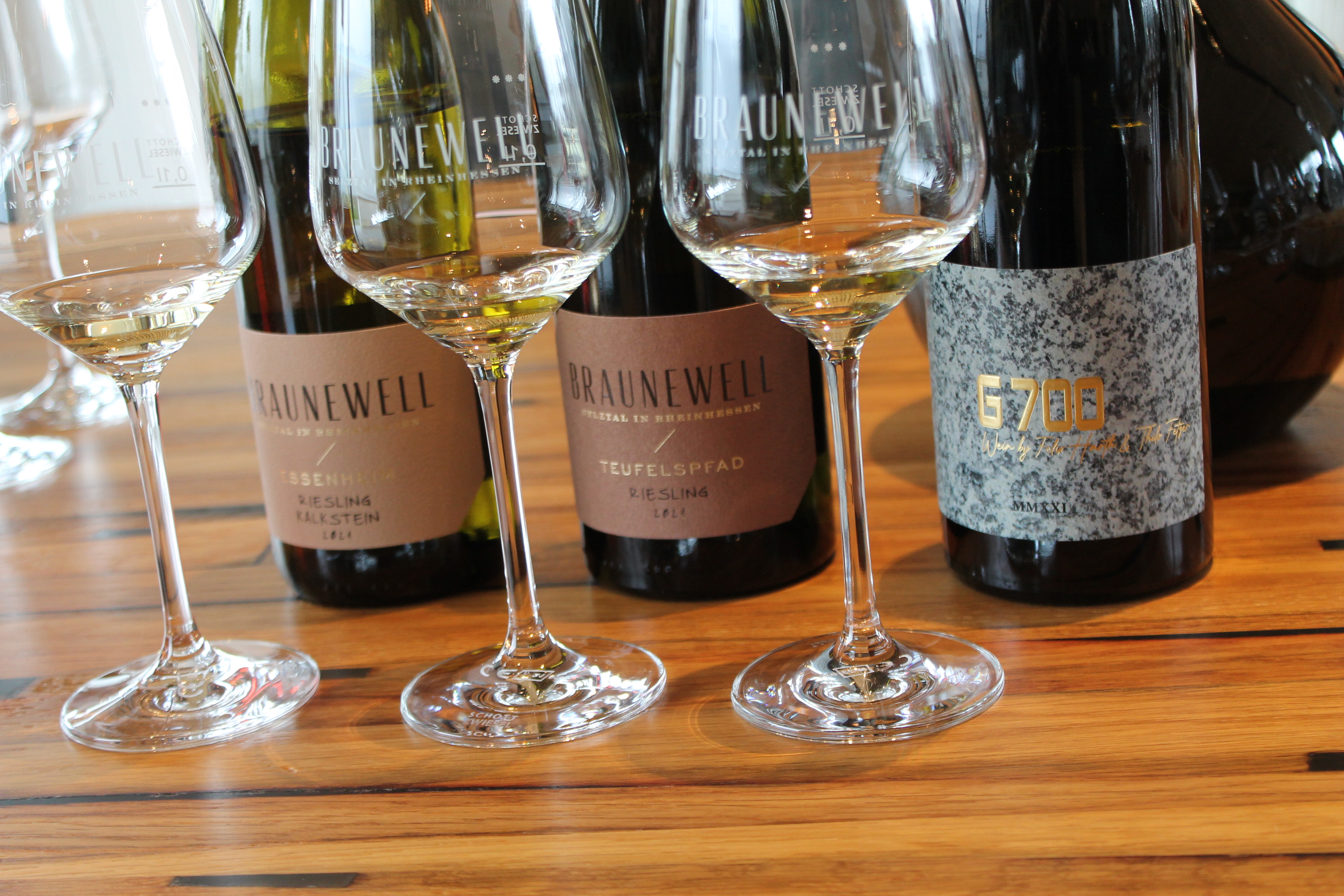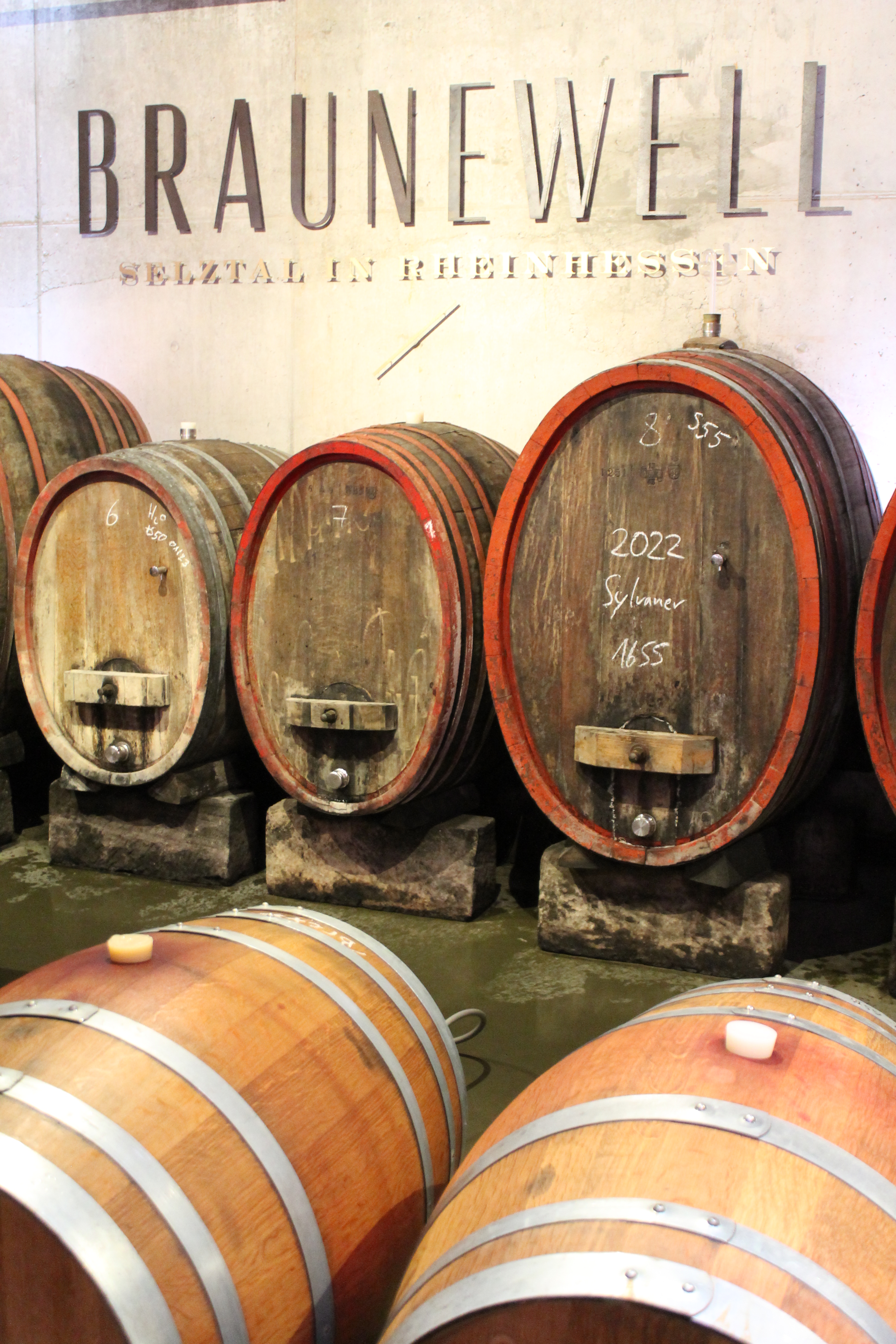 Freitag, 13 Uhr, Hauptbahnhof Mainz. Die Bahn streikte nicht, daher stand dem pünktlichen Start nichts im Wege. Aus allen Himmelsrichtungen fanden sich Weininteressierte ein, die im Laufe des Wochenendes zu einer entspannten Gruppe zusammenwuchsen. Ein Welcome-Lunchpaket und eine halbe Stunde später, vorbei am Lärchenberg, dem Sitz des Zweiten Deutschen Fernsehens, gibt es auch schon den ersten Bottle Stop beim Weingut Braunewell im Selztal. Die jüngste Generation des Familienweinguts hat erst kürzlich ein modernes Weingut auf den alten Keller gebaut. Das Weingut ist ein gutes Beispiel für die Vielschichtigkeit der Region, legt aber gleichzeitig auch einen Schwerpunkt auf hochwertige Winzersekte. Nach dem Empfang mit einem Riesling Sekt geht es in den Keller zu den Rüttelpulten, wo wir das gesamte Schaumweinsortiment verkosten.
