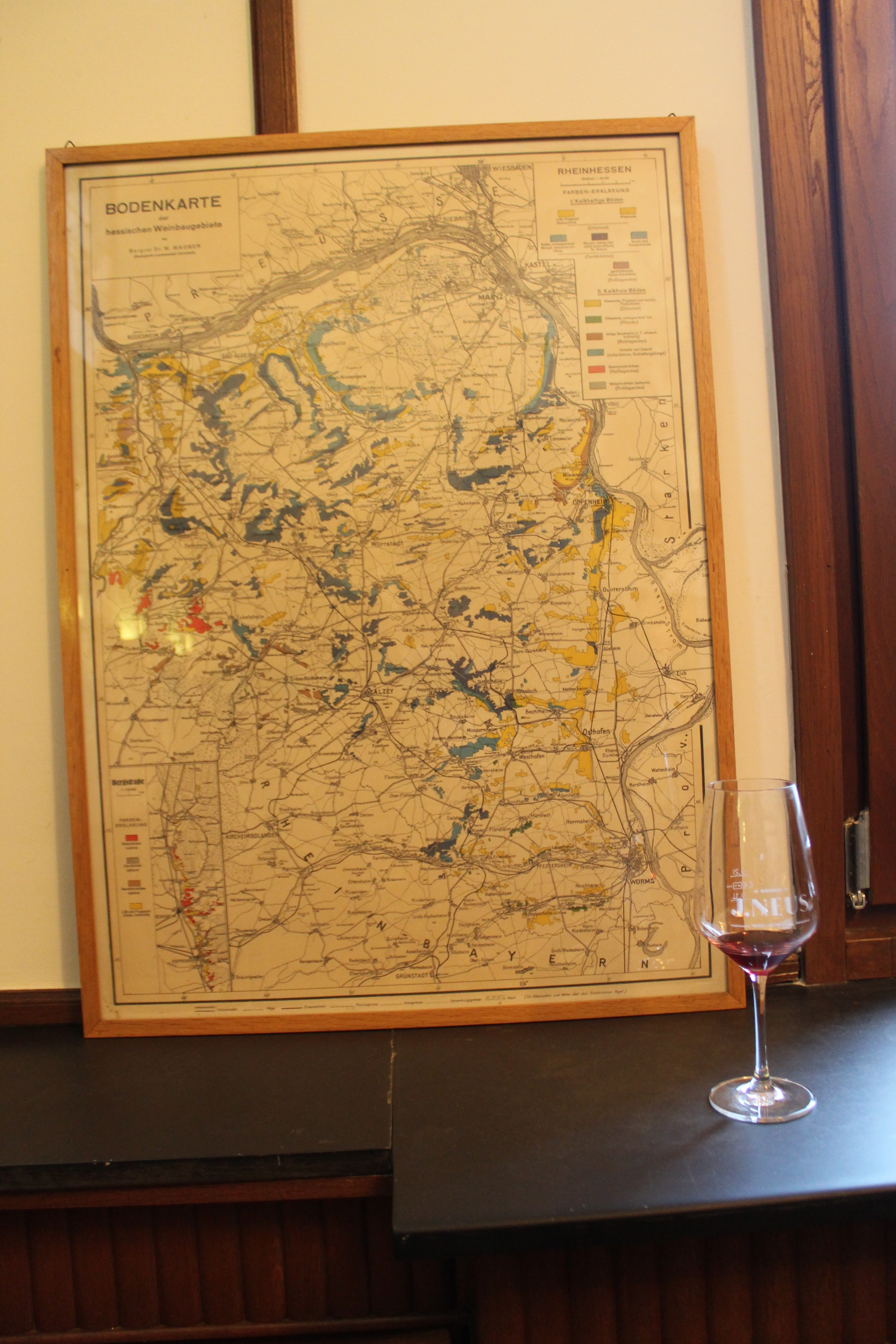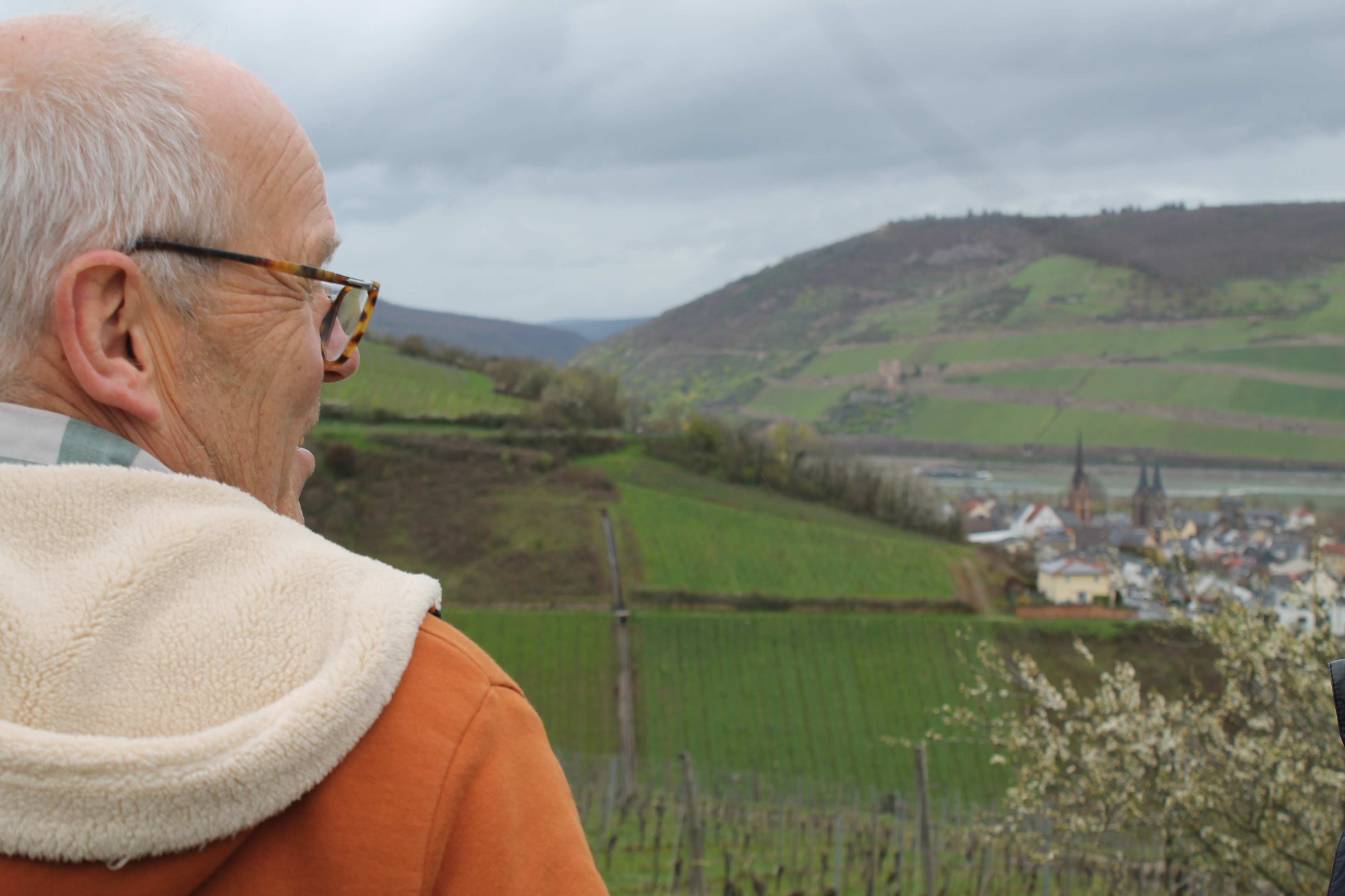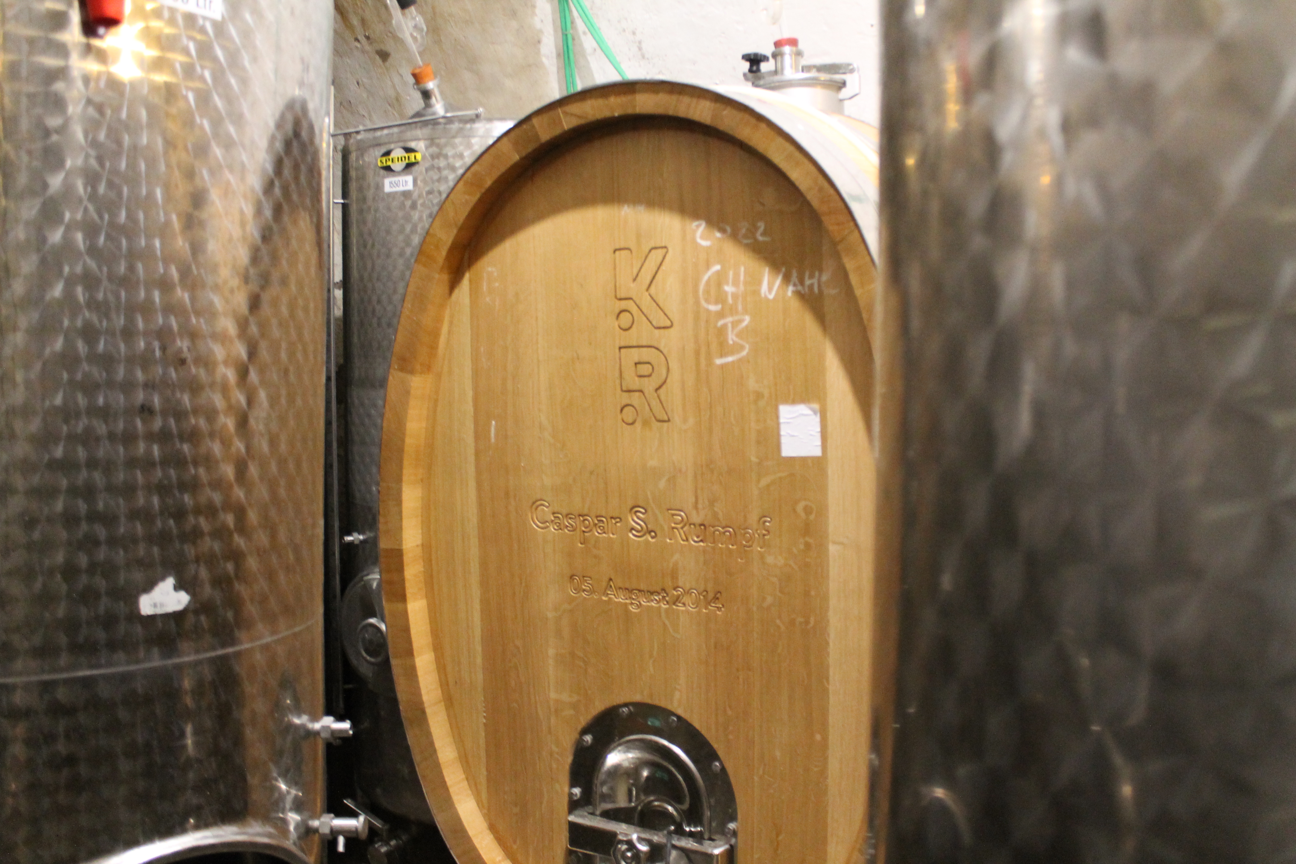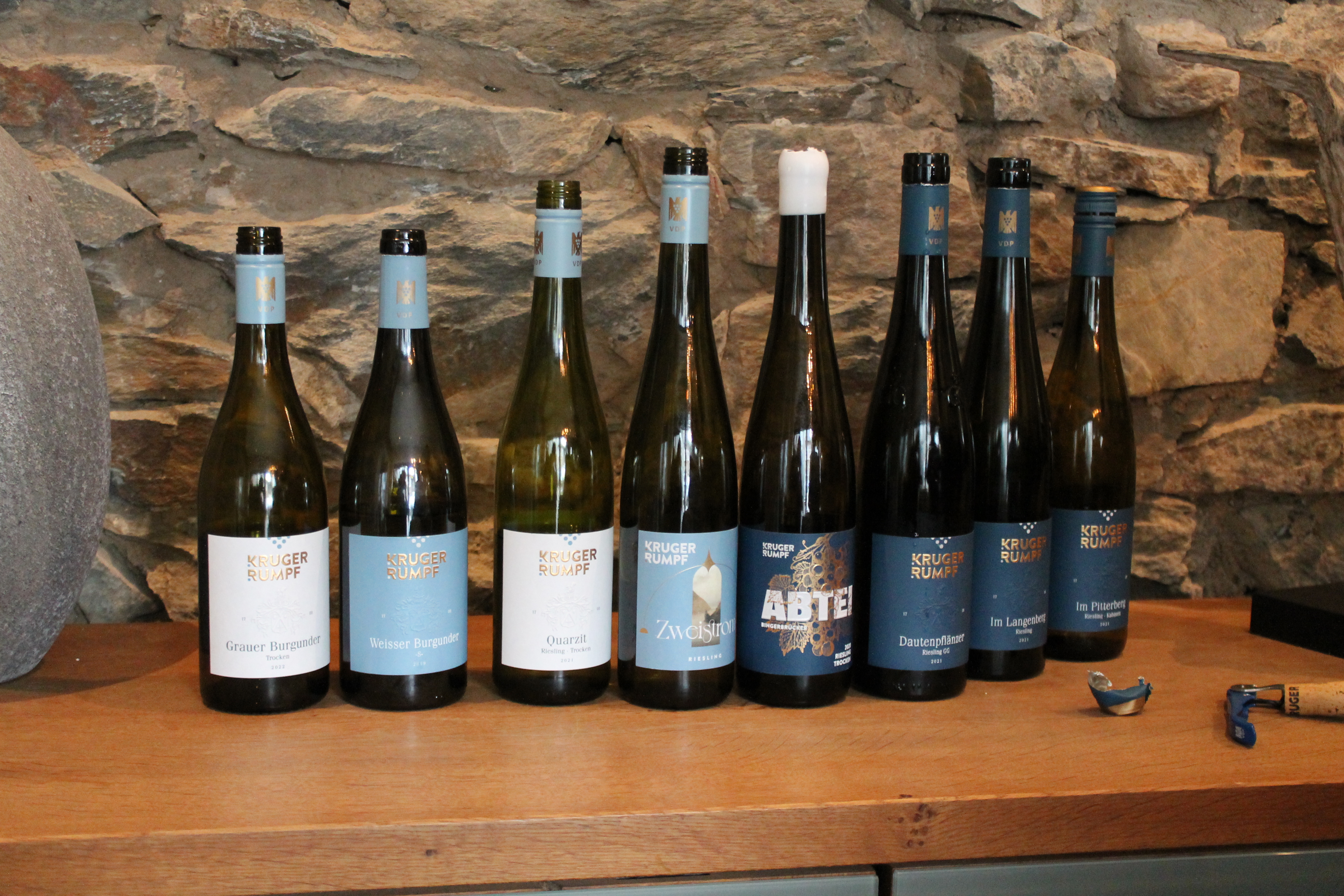 Am Nachmittag geht es an den Nordrand Rheinhessens, nach Bingen zum Bottle Stop 3. Hier ist das Weingut Kruger Rumpf beheimatet, die ihre Wurzeln sowohl in Rheinhessen als auch der Nahe haben. Der Senior-Winzer und Vorstand im Team Graue VDP Adler Nahe, führt uns in die Weinberglage Abtei Rupertsberg – ein einmaliger geografischer Punkt. Denn man steht im Weinbaugebiet Nahe, blickt über den Rhein auf die Lage Berg Schlossberg des Rheingaus, hinter der nächsten Rheinbiegung liegt das Weinbaugebiet Mittelrhein und rechter Hand über dem Fluss Nahe das Weinbaugebiet Rheinhessen. Von dort führt und Stefan Rumpf vorbei an den Weinbergschafen und dem hauseigenen Kompost zur GG Lage Im Pitterberg. Auf dem Weg zurück ins Weingut fahren wir noch am Goldloch vorbei, eine eindrucksvolle Fahrt über Schiefer, Quarzit und Phylitböden. Die Eindrücke, die wir in den Weinbergen sammeln konnten, spiegeln sich auch im Glas bei der Verkostung wider. Den Tag lassen wir in der Weinstube des Weingut, dass von Frau Rumpf geleitet wird, köstlich mit Kabi ausklingen.