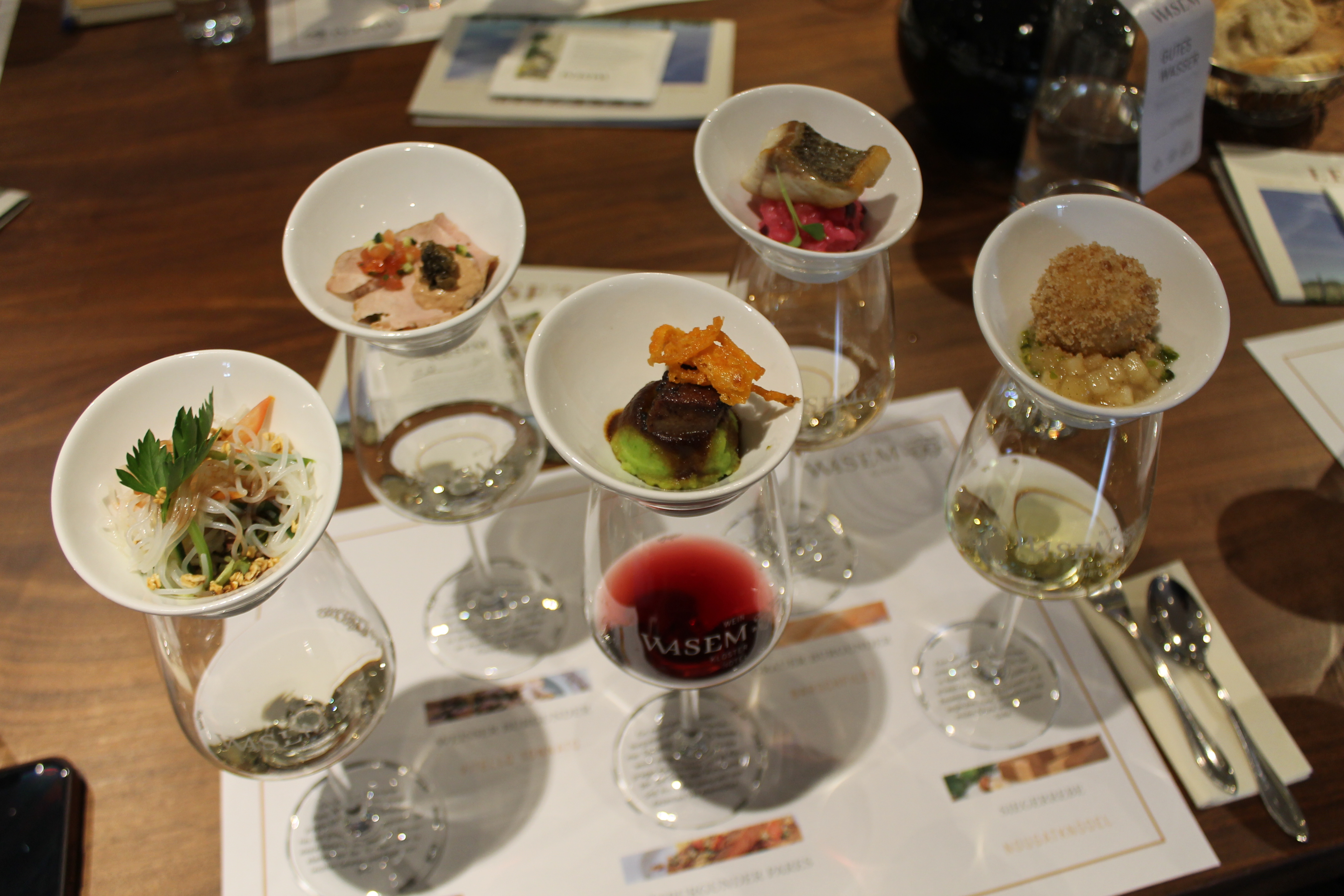 Anschließend werden im Verkostungsraum zu kleinen Snacks die Stillweine des Hauses verkostet, darunter Rosés und Riesling, der mit etwas unter einem Drittel die am häufigsten angebaute Weißweinrebsorte ist. Im Glas ein Ortswein, ein Lagenwein und ein experimentell im Steinzeug ausgebauter.